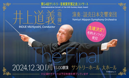 毎年、わが国の洋楽の発展にもっとも顕著な業績のあった個人または団体に贈られるサントリー音楽賞。第54回(2022年度)は井上道義が受賞し、2024年12月30日の受賞記念コンサートは、8月のチケット発売後、直ぐに完売となりました。このたび有料オンライン(ライブ&リピート)配信が決定し、視聴券3,000円を発売中です。