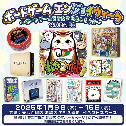 東武百貨店 池袋店7F 3番地 イベントスペースにて、2025年1月9日(木)~15日(水)の一週間、ボードゲームの体験会&販売イベント「ボードゲームエンジョイウィーク」が開催されます。