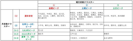 【図1】月変動クラスター、曜日変動クラスターの区市町村分類