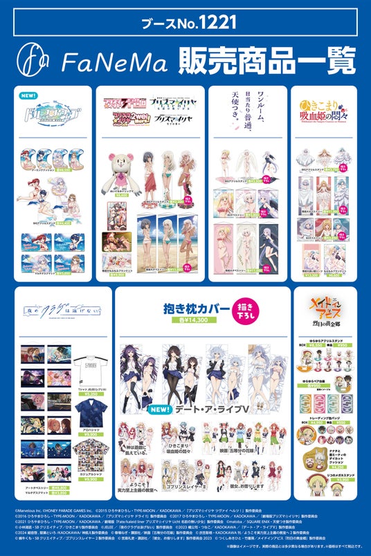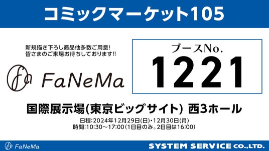 システムサービス株式会社(本社:東京都豊島区、代表取締役社長:田村宗弘)は、アニメ・マンガ・ゲーム作品等のキャラクター商品の企画・製作・販売をする自社ECサイト「FaNeMa」(URL:https://fanema.jp/)ブランドにて、2024年12月29日(日)・12月30日(月)に開催される「コミックマーケット105」に出展いたします。