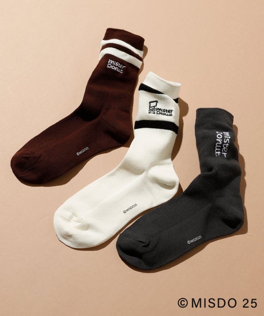 ミスタードーナツのロゴ入りのシンプルなリブソックス。ドーナツをイメージしたブラウン、ベーシックなアイボリー、ブラックの全3色展開です。季節問わず履きやすく、コーディネートのアクセントにもぴったりです。
