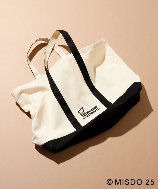 ミスタードーナツお馴染みのロゴが入ったシンプルなデザインのトートバッグ。A4サイズやパソコンなど大きめの荷物を収納することができるので、普段使いから旅行にもおすすめです。コーディネートに合わせやすいアイボリーとブラックの2色でご用意しています。