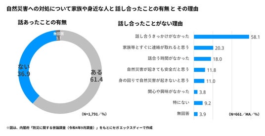 しかしながら、内閣府が令和4年9月に実施した「防災に関する世論調査」によると、「自然災害への対処について家族や身近な人と話し合ったことがない」と回答した人は36.9%。その理由として「話し合うきっかけがなかった」が約6割(58.1%)とトップ。また、「家族等とすぐに連絡が取れると思う(20.3%)」、「話し合う時間がなかった(18.0%)」の他、自然災害が起きたとしても安全だと思う・起きないと思うなども一定数見受けられました。