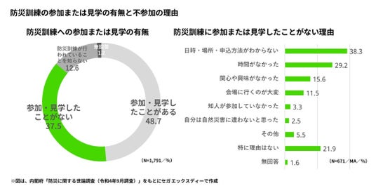 また、防災訓練の参加または見学に関する質問では、「参加・見学したことがない」と回答した人は37.5%。その理由として「日時・場所・申込方法がわからない(38.3%)」の他、時間がない・関心や興味がない・会場に行くのが大変など、人々が防災の知識を学ぶための防災訓練においても参加する上でハードルが存在することがわかります。