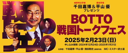 本市では、「高槻市に行けば、好きなことに没頭できる」というテーマのもと、グルメ、歴史などから1つのジャンルを絞り、そのジャンルが好きな人に対して深くPRする観光プロモーション「BOTTOたかつき」を展開中。今回のイベントは歴史好きの方をターゲットにした「BOTTO戦国」の一環として開催します。イベントの注目ポイントは、なんといっても出演陣の豪華さ。大河ドラマの城郭考証担当や日本100名城・続日本100名城選定委員を務める城郭考古学の第一人者・千田嘉博さん、大河ドラマの時代考証担当を務め、戦国関連のイベント講演が常に大入り満員の歴史学者平山優さん、歴史解説YouTubeチャンネル「戦国BANASHI」を運営する総再生回数約6000万回の大人気歴史YouTuberミスター武士道さんの3人が出演します。当日の主なテーマは、同市三好山にあり、大阪平野を見渡す天然の要害を利用した戦国時代屈指の山城「芥川城」と慶安2(1649)年に譜代大名の永井直清が入城し、以降13代約220年間にわたって永井家が治め、北摂唯一の近世城郭として京・大坂を守る重要な役割を担った「高槻城」。千田さんと平山さんが芥川城と高槻城の城跡を実際に巡る動画を上映しながら、ミスター武士道さん司会のもと、歴史探求を趣味の一つとする濱田剛史市長も参加し、4人で城跡の見どころや戦国高槻の歴史的意義などについて熱く語り合います。ぜひイベントに参加し、高槻の歴史に「BOTTO」しましょう!