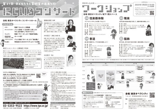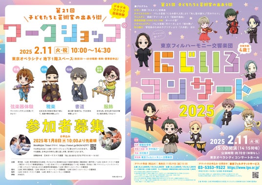 東京フィルハーモニー交響楽団(以下、東京フィル)は2025年2月11日(火・祝)に東京オペラシティ(東京都新宿区西新宿3-20-2)で「第21回子どもたちと芸術家の出あう街」(主催:東京都、公益財団法人 東京都歴史文化財団、子どもたちと芸術家の出あう街実行委員会)を開催します。