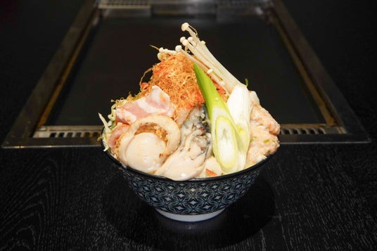 土俵席で楽しむなら、やっぱりこれ!通称「♯ドスコイもんじゃ」。新鮮な魚介や野菜、地鶏肉団子や鶏肉をふんだんに使った栄養満点のもんじゃ。豪華な具材が贅沢に盛り込まれ、食べるたびに旨味が溢れ出します。美味しさはまさに横綱級!力強い味わいが、食欲を満たします。