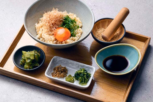 京都の老舗醤油蔵元の卵かけ専用醤油で薬味とご一緒に。
