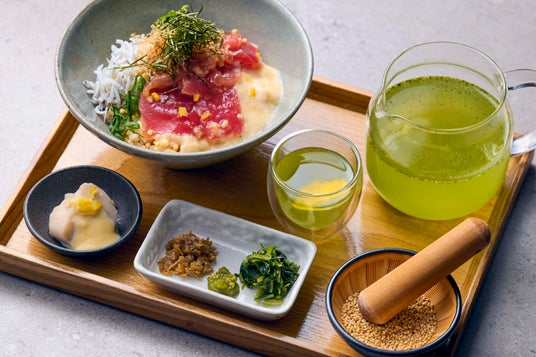 塩麹漬けマグロと釜揚げしらすの柚子茶漬け生の柚子が香る煎茶でいただく冬のお茶漬け。