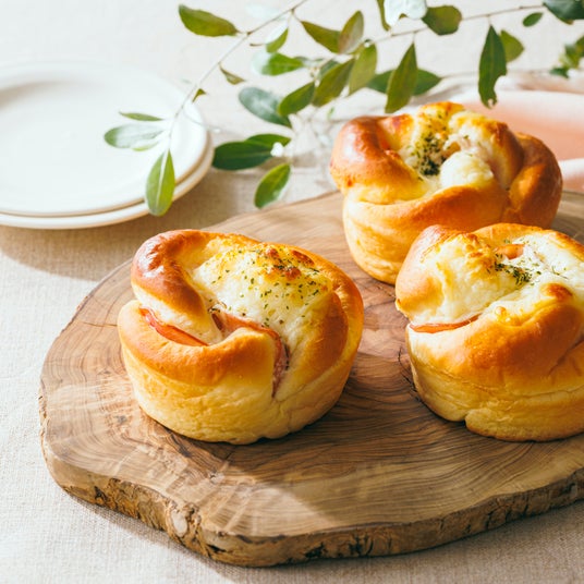 ハムとチーズフィリングをのせ、ふっくらとした生地で巻き込みました。4種のチーズ(カマンベール・チェダー・マスカルポーネ・クリームチーズ)のソースがとろりと溶けた程よい焼き目が、香ばしい風味と食欲そそる見た目に仕上がっています。