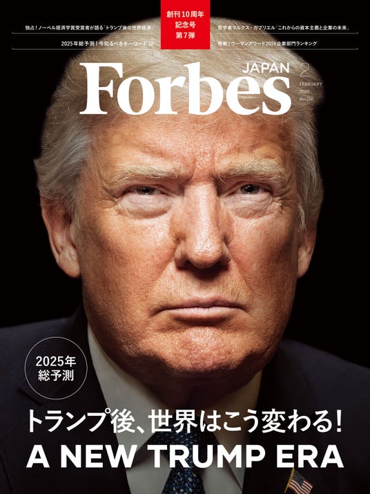 Forbes JAPAN 2025年2月号は、国内外の賢人たちによる「2025年総予測」を特集。第2次トランプ政権が発足する25年1月以降、世界経済はどうなるのか。また、加速する人口減少のなかで日本経済はどう変化するのか。研究者・経営者・アーティストなど各界の第一人者へのインタビューから未来を紐解き、今を生きる私たちにとっての「希望」を描き出す。第2特集では「WOMEN AWARD 2024」の企業部門ランキングを発表。「本当に女性が活躍している会社」を100社紹介し、真のダイバーシティ企業を見極める。