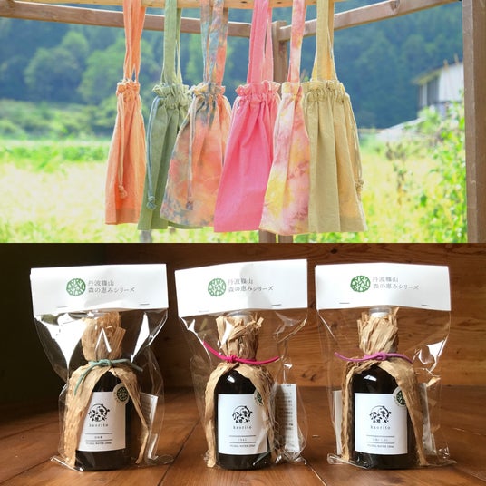 丹波篠山の森の資源である丸太や枝葉などを、日常の生活に感じられるような商品開発やイベントを開催。今回は、100%天然の精油やフローラルウォーター、トートバッグなどをラインアップ。