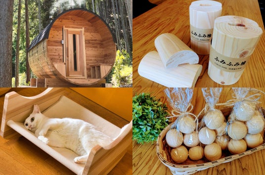 兵庫県産木材の需要拡大のため、建築から木工製品の販売まで様々なサービスを展開。今回は、バレルサウナをはじめ、健康グッズや猫用ハンモックなどより身近に木のぬくもりや癒しを感じることができる木工製品を紹介します。