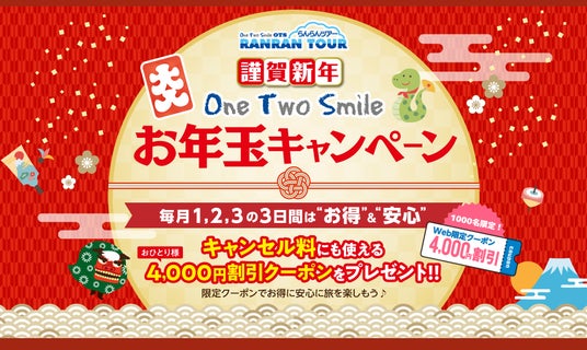 沖縄ツーリスト株式会社((本社:沖縄県那覇市、代表取締役:東良和)の沖縄旅行専門サイト「らんらんツアー」で毎月開催されている「One Two Smileキャンペーン(※概要は以下参照)」が、1月は新春お年玉セールとして通常2,000円割引クーポンが4,000円割引になります。クーポンは全商品が対象で、「Enjoy連泊キャンペーン(※1)」や「みんなでJAL旅キャンペーン(※3)」といった他のキャンペーンとの併用も可能となっており、らんらんツアーで沖縄旅行を予約するならお得な3日間となっています。