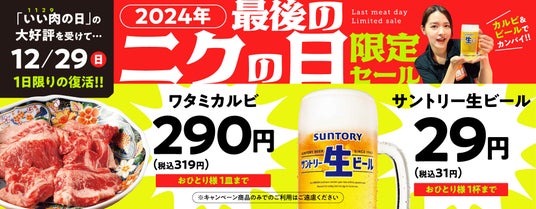 「いい肉の日」の11月29日に実施した「いい肉の日の特別セール」の大好評を受けて1日限りの復活企画です。2024年の焼肉納めとして、「今日は焼肉にしよう」とカルビとビールでカンパイ!を気軽に楽しむことができるこの機会にぜひお気軽にお立ち寄りください。