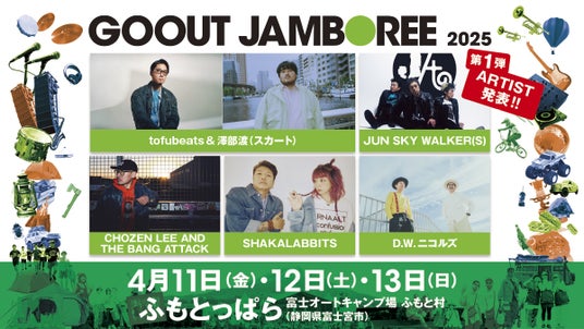 アウトドアファッション雑誌「GO OUT」が主催する、キャンプ初心者から、ソロ、カップル、ファミリー、グループまで、誰もが楽しめるキャンプと音楽のフェスティバル 「GO OUT JAMBOREE 2025」が、2025年4月11日(金)~13日(日)の3日間、ふもとっぱら(静岡県富士宮市) にて開催。
