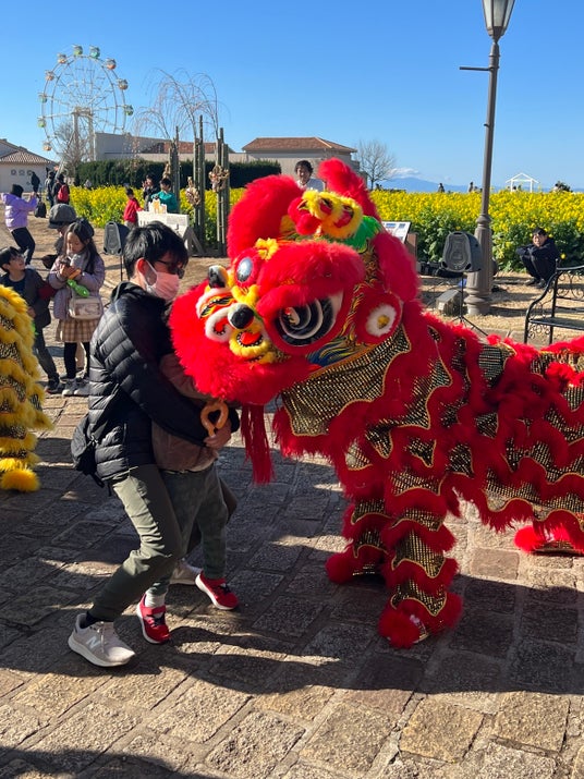 満開の菜の花畑と富士山の絶景が楽しめる横須賀・ソレイユの丘で、獅子舞や中国雑技公演などの『開運爆上がりイベント』を1月1日(水・祝)から13日(月・祝)まで期間限定で開催。