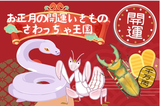 縁起の良いいきものたちと触れ合って心願成就へ!白ヘビのほか、ハナカマキリやババオウゴンオニクワガタも登場!