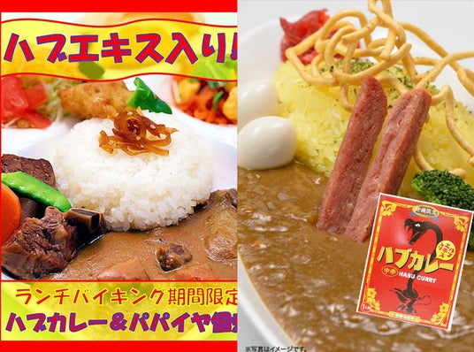 左)健食バイキングちゅら島「ハブカレー」 右)地ビール喫茶「ハブカレー」