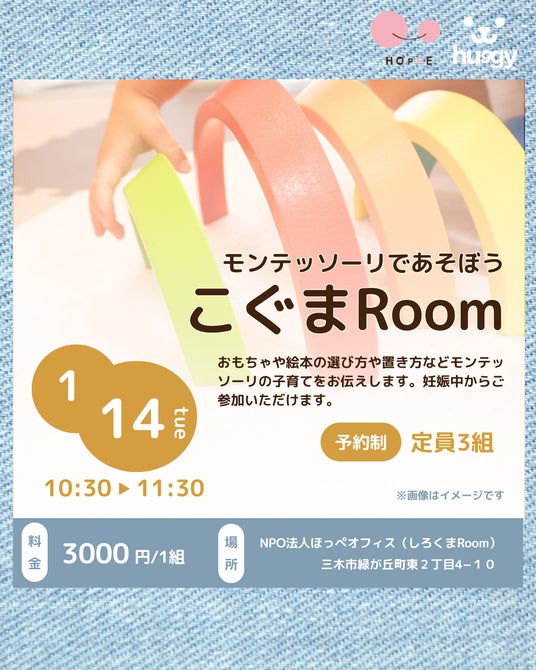 特定非営利活動法人ほっぺ(代表:大森 奈津子)は、ほっぺオフィス(兵庫県三木市)にて開催される親子参加型のイベント「こぐまRoom」の参加者を募集します。当団体が運営する認可外保育園しろくまRoomのお部屋にあるモンテッソーリ教具で遊びながら過ごせます。おもちゃや絵本の選び方、置き方などモンテッソーリを取り入れた子育てをお伝えします。妊娠中の方もご参加いただけます。ぜひ一度、「こぐまRoom」を体験してみませんか?1月14日(火)10時30分~11時30分までの開催となります。
