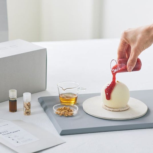 バニラクリーム・スポンジ・苺ジュレを薄くホワイトチョコで包み込んだベースのケーキに、フルーツソース(イチゴ)、フレーバー(オリーブオイル・ピスタチオ・ゲランドの塩)、ティー(アールグレイ)をセットにしてご提供いたします。生菓子は、実店舗のみで販売している商品となります。この機会にぜひ味わってください。