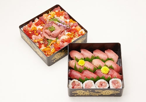 (18×18×5cm×2段/3人用)一の重:まぐろづくし、二の重:海鮮ちらし寿司。