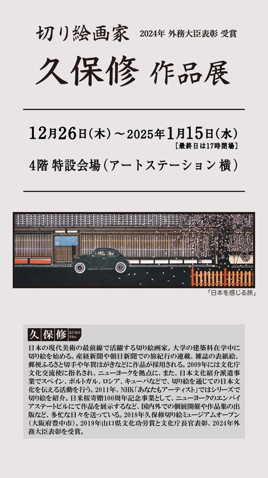 【東急百貨店 たまプラーザ店】世界中に日本の美を伝え、今年外務大臣表彰を受賞した 切り絵画家『久保修 作品展』目を見張る光と影の表現は唯一無二。2024年12月26日~2025年1月15日まで。
