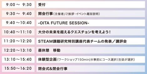 その中で、本イベントでは『越えよう、未来の予測を。』をテーマに、分野横断的なクリエイティブ思考や発想力を養う講座やワークショップ等を実施し、実社会とのつながりを考え、次世代の先端科学技術分野を担う人材を育成する取り組みを推進していきます。(主催:大分県教育委員会 /運営協力:株式会社BarbaraPool・一般社団法人STEAM JAPAN)