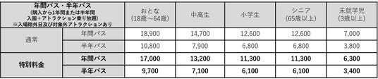 100万人記念特別年間パス&半年パスの料金表