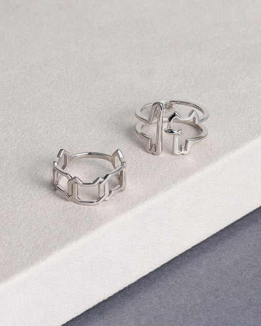 直線で描いたねこの顔が交互に繋がれたデザインのリングは、よく見るとねこのシルエットが浮かび上がるグラフィカルなデザイン。程よい幅がありながら軽やかな仕上がり。