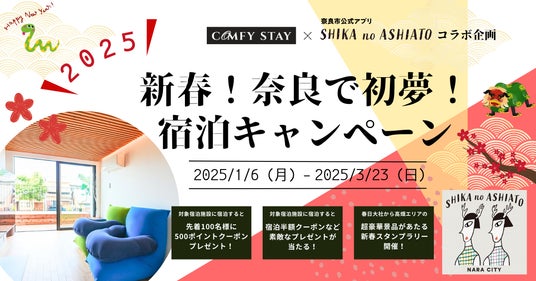 宿泊キャンペーンを通じて、国内外からの観光客を誘致し奈良の魅力を広く知ってもらうため、奈良市で19の宿泊施設を運営する「Comfy Stay」と奈良市公式アプリ「SHIKA no ASHIATO」のコラボ企画を実施します。