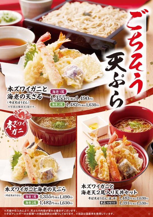 家族亭では、年始より「本ズワイガニと海老の天ざる」を継続販売いたします。