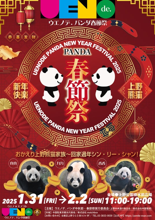 ウエノデパンダ春節祭実行委員会(上野中央通り商店会・株式会社中国電視)は、2025年新春も「パンダと文化と交流の回家過年」をテーマに掲げ、上野公園噴水広場で盛大に「ウエノデパンダ春節祭」を開催いたします。
