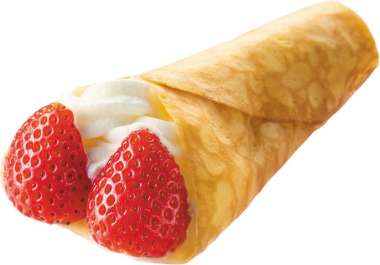 【内容】もちもち食感のクレープ生地で、いちごのムース・ホイップクリーム・スポンジを包み、フレッシュいちごをトッピングしました。甘ずっぱいジューシーないちごの香りが特長です。