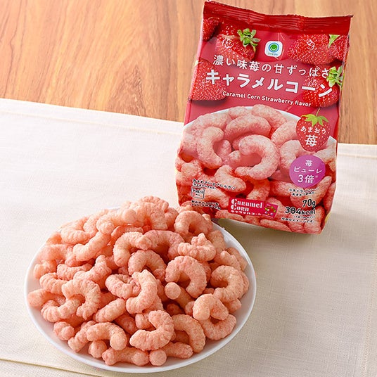 【内容】あまおう苺原料を使用した、甘ずっぱさとサクサク食感が特長の商品です。蜜に苺ピューレを「キャラメルコーン あまおう苺味」の3倍、シーズニングにあまおう苺パウダーを使用し、濃厚ないちご味に仕立てました。