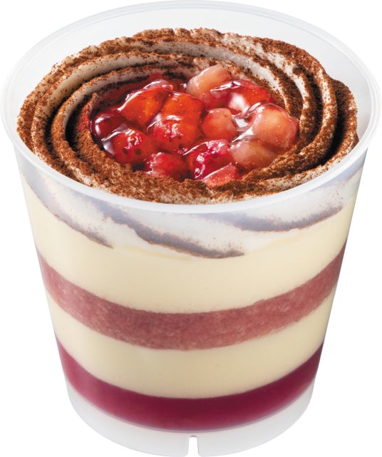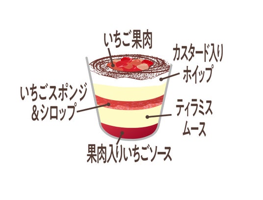 【内容】果肉入りのいちごソースとティラミスムースを重ねたふわとろ食感のティラミスです。甘ずっぱいいちごと、ミルキーでまろやかなマスカルポーネの味わいが楽しめます。