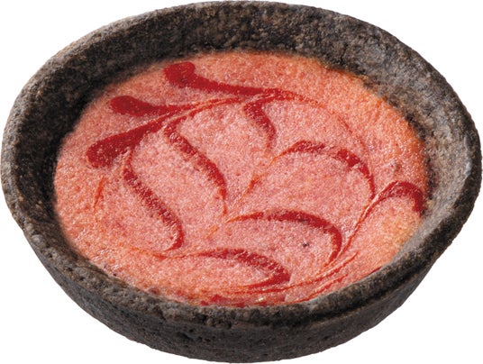 【内容】ココア生地のタルトにいちごピューレを練り込んだチョコ生地を流し込み、ソースをトッピングし焼き上げました。