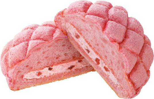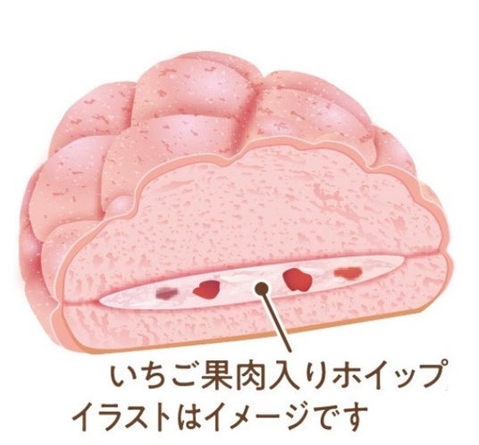 【内容】いちご風味のピンク色のパン生地といちご風味のピンク色のビスケット生地のメロンパンに、甘ずっぱいいちご果肉入りのホイップをサンドしました。ホイップもパン生地もビス生地もピンクに仕上げました。
