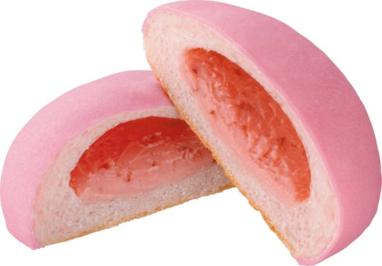 【内容】ピンク色の生地をかぶせたもちっとしたパン生地で、いちご果肉入りの甘ずっぱいいちごクリームを包んで焼き上げました。