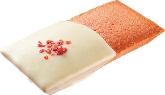 【内容】ニュージーランド産バターといちごピューレを練り込んだフィナンシェにホワイトチョコを半分コーティングし、乾燥いちごのフレークをトッピングしました。