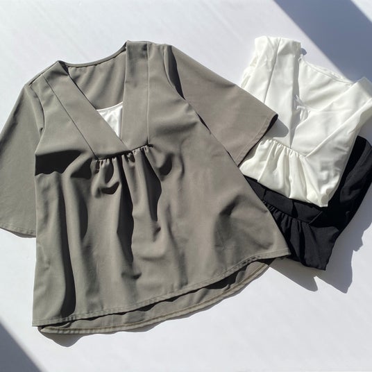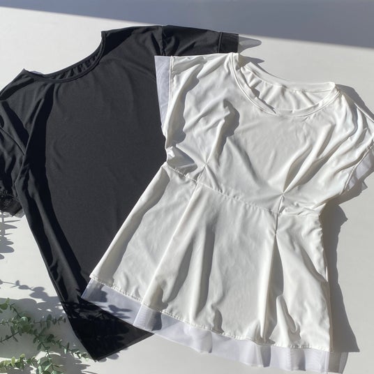(左)UVカットメッシュストレートTシャツ 12,100円、(右)UVカットタック入りメッシュフレアTシャツ 17,600円