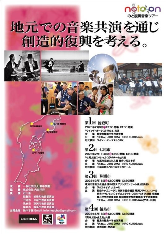 大人の社会塾「熱中小学校」を運営している一般社団法人熱中学園(代表理事:堀田一芙、東京都墨田区)は、能登半島地震から2年目になる2025年2月-5月に能登半島地震被災地4か所で、「のと復興音楽ツアー」を地元音楽愛好家と開催します。