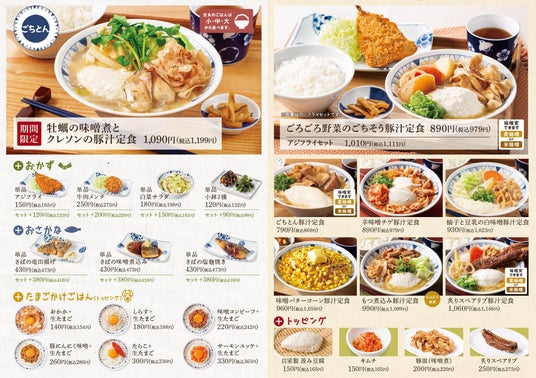 常時ご用意している7種類以上の多種多様な豚汁に「おかず」「おさかな」「たまごかけごはん」を追加すれば、お気に入りの定食を見つけたり、新しい組み合わせを探したりと、来店する度に楽しみ方が広がります。