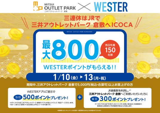 当日、三井アウトレットパーク 倉敷にて5,000円(税込・合算可)以上お買い上げ、かつWESTERアプリご提示で当日WESTERポイント500ポイントをプレゼントいたします。さらに、当日鉄道利用(JR倉敷駅)し、来館いただいた方にはWESTERポイント300ポイントを後日プレゼントいたします。