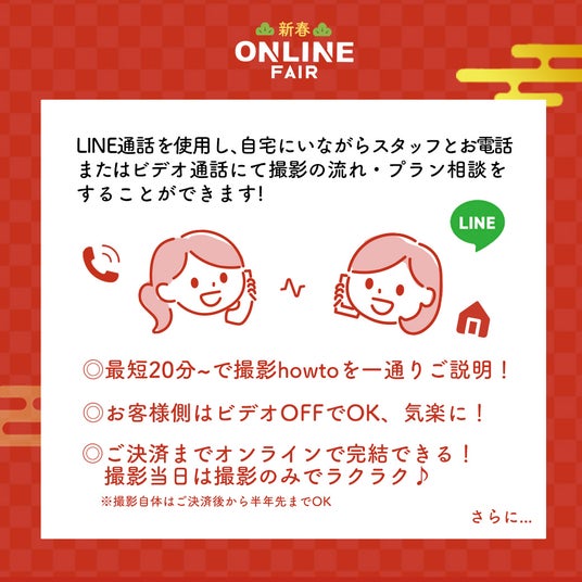 LINEビデオ通話を使用して、ご自宅にいながら撮影プランやスタジオ、撮影日を決めていただけます。
