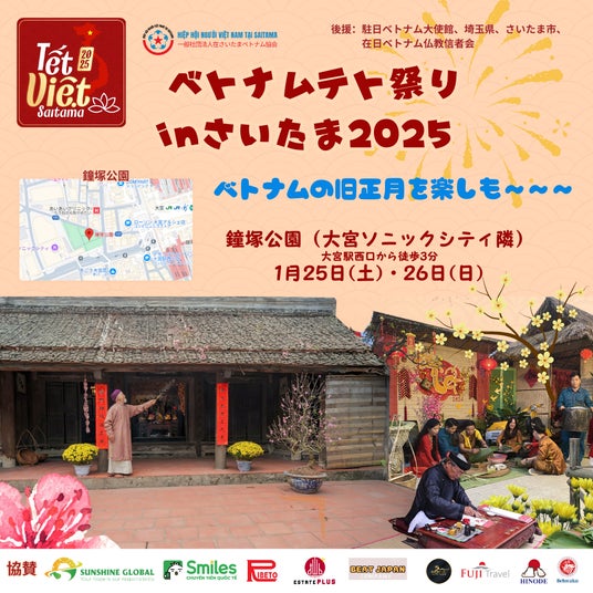 一般社団法人在さいたまベトナム協会(埼玉県蕨市塚越1-2-14、代表理事:PHAM DINH THUONG)は、2025年1月25日(土)・26日(日)、大宮駅前の鐘塚公園(埼玉県さいたま市大宮区桜木町1-7-8)で第1回「ベトナムテト祭り in さいたま 2025 (Tết Việt Saitama 2025)」を開催します。