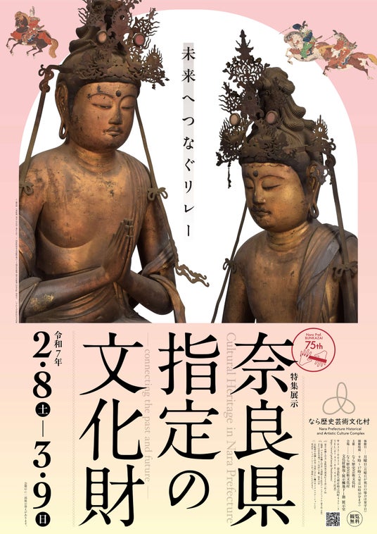 昭和25年(1950)、文化財保護の基本法である「文化財保護法」が制定されました。同じ年、奈良県では、文化財保護法に先駆けて全国でもいち早く文化財行政を担当する「文化財保存課」を設置しています。令和7年(2025)は、それから75年目となる節目の年です。本展では、奈良県における文化財保護の歴史をたどるとともに、なら歴史芸術文化村で修理が完成した文化財と、近年奈良県指定文化財となった文化財を展示します。