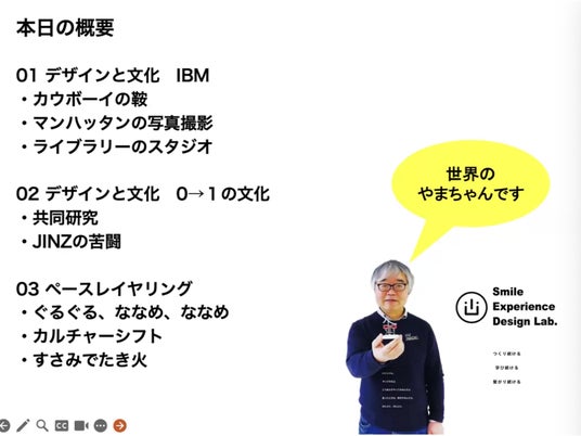 続いて、デザイン文化についての探究と実践をされている山崎和彦氏(X デザイン研究所、武蔵野美術大学ソーシャルクリエイティブ研究所)より「組織やコミュニティーのための、カルチャーとデザイン」についての講演をいただきました。