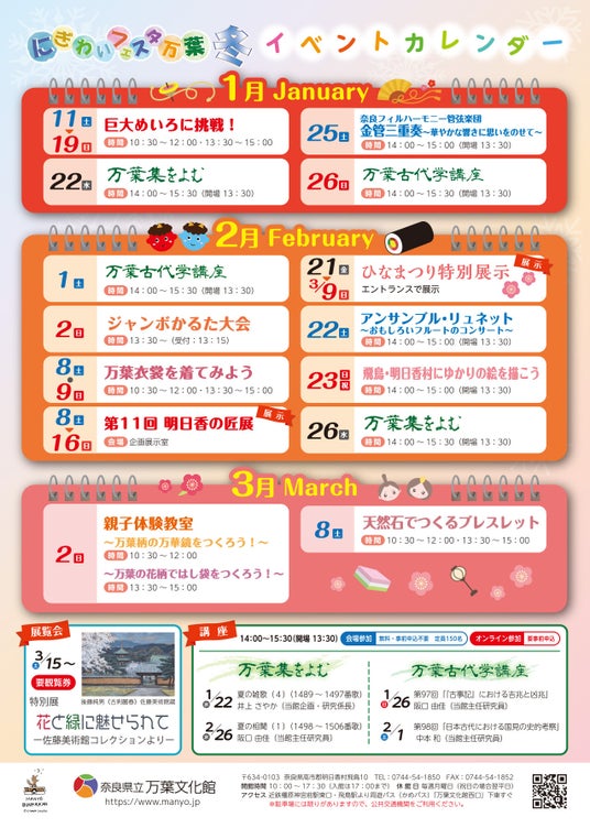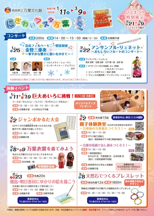 万葉文化館では1/11(土)~3/9(日)の間、「にぎわいフェスタ万葉 冬」を開催します。