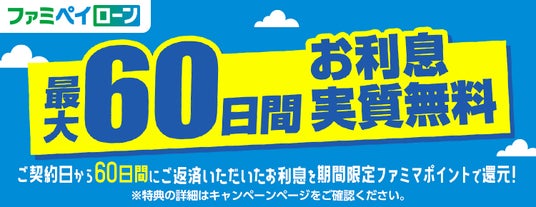 新規にファミペイローンをご契約いただくと、ご契約日を含む60日以内にご返済いただいた際の利息相当額を期間限定ファミマポイントで還元します。還元に上限はございません。